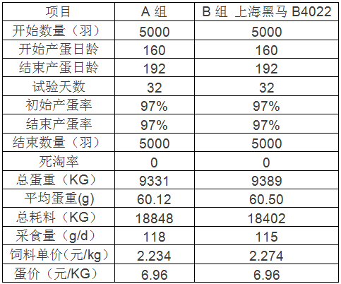 將10000羽雞分為兩組,分別飼喂黑馬B4022和另一知名品牌5%蛋雞料,用料32天后,計算實證數(shù)據(jù)核算經(jīng)濟效益,為后期全群飼喂提供精確依據(jù),飼喂數(shù)據(jù)如下: